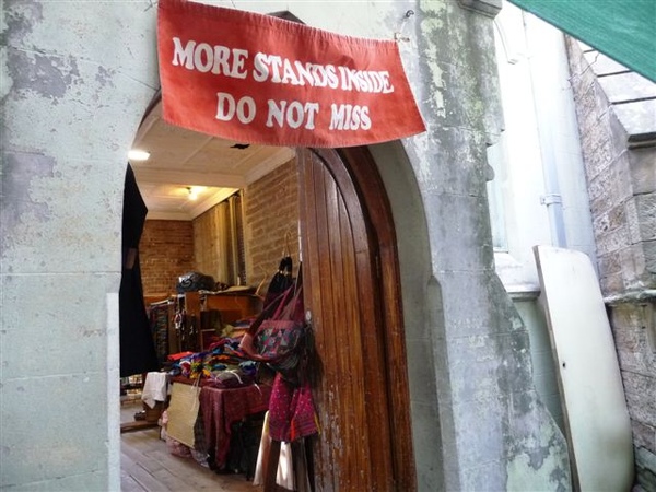 當你從主要入口進入包曼市集, 循著小路往右前方走到盡頭時, 可別只記得上洗手間喔, 因為還有一些攤位是位在室內的, 沿著樓梯往上走, 就可以到室內攤位區, 有一個固定攤位是賣西藏風味及泰式的衣服、絲巾等, 還有一個攤位賣的是中式的家飾品, 偶爾也有其他不同的攤位。出了這個室內區, 其實是連到包曼市集的另一頭的戶外攤位, 也就是從主要入口進入市集時, 循著小路往左前方走到盡頭的地方。這邊其實也有一個次要入口可以進入市集, 在這個入口旁, 也有賣繪畫、藝術品的攤位, 因為在馬路旁, 他們的商品也沿著教堂的欄杆擺放, 所以開車或走經過的人就可看到其商品展示了, 很像是參觀一個露天藝廊般。